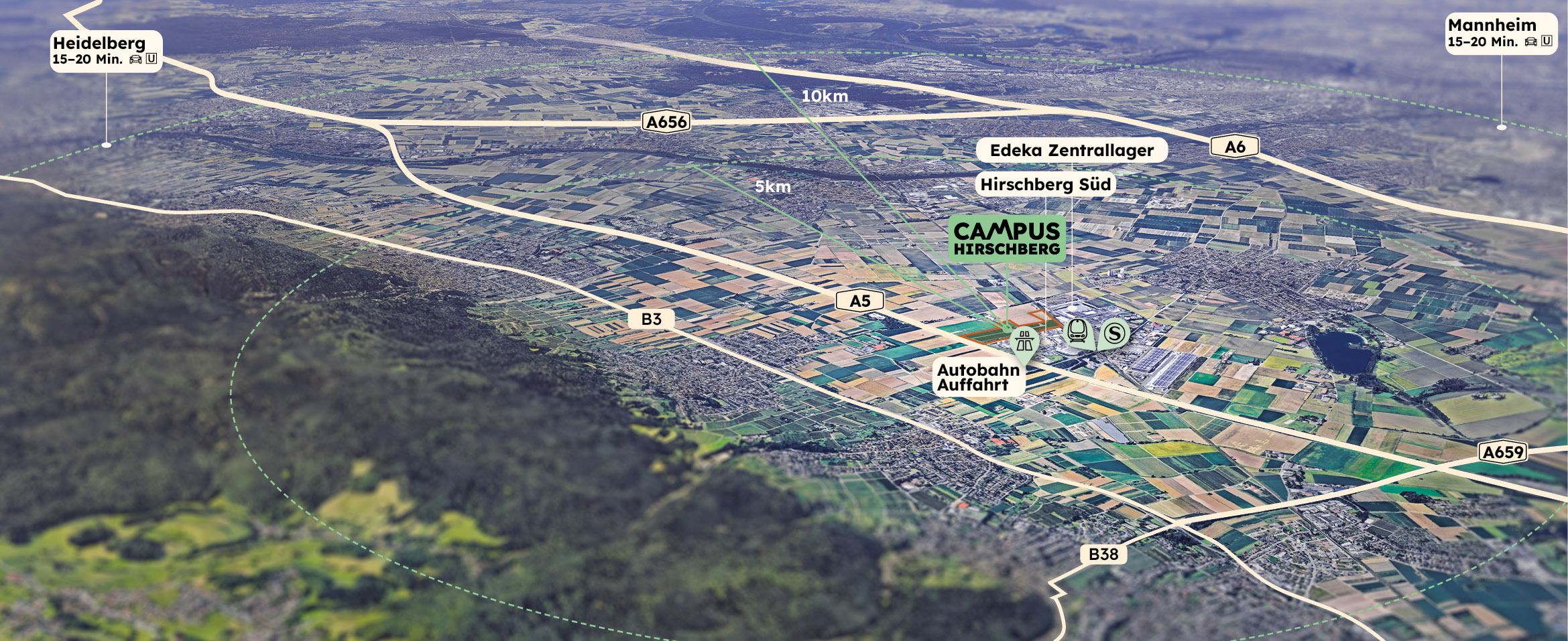 Außerordentlich gute Verkehrsanbindung für regionale, überregionale und internationale Unternehmen im Dreieck Mannheim – Heidelberg – Weinheim. Der Campus Hirschberg liegt im Zentrum der Metropolregion Rhein-Neckar, die mit ca. 2,4 Mio. Einwohnern und rund 920.000 Beschäftigten zu den bedeutendsten Wirtschaftsstandorten Deutschlands zählt.